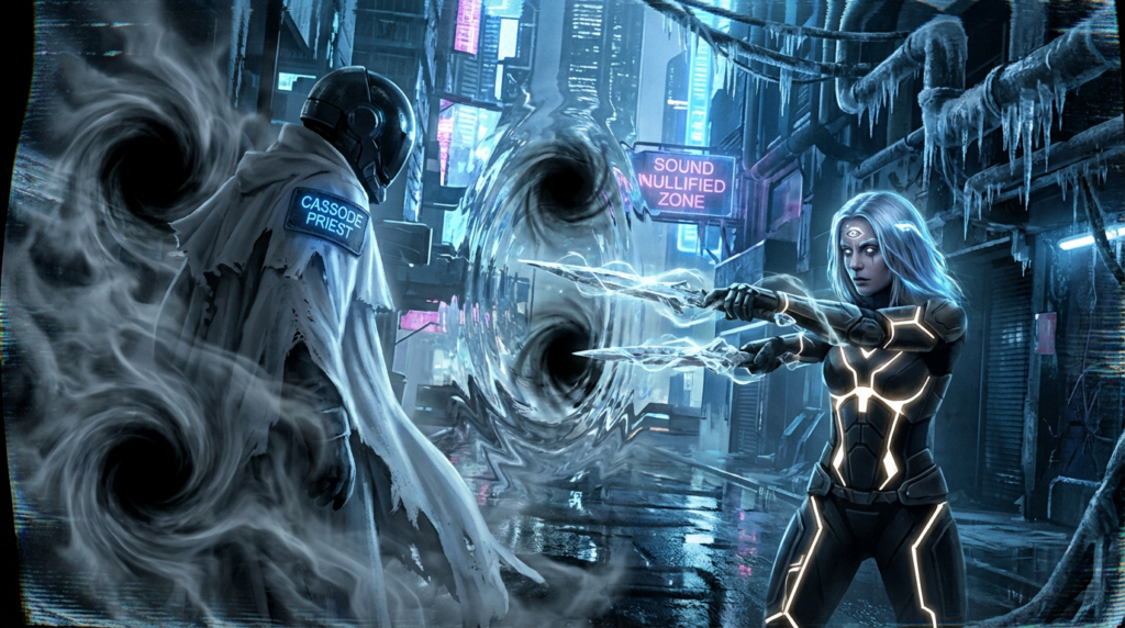 私は帯域の刃を編み──銀の光を纏った、微細な刃紋が空間に閃く──首筋へ迫る「陰極の口づけ」を切り裂きながら、はっきりと宣言する。
