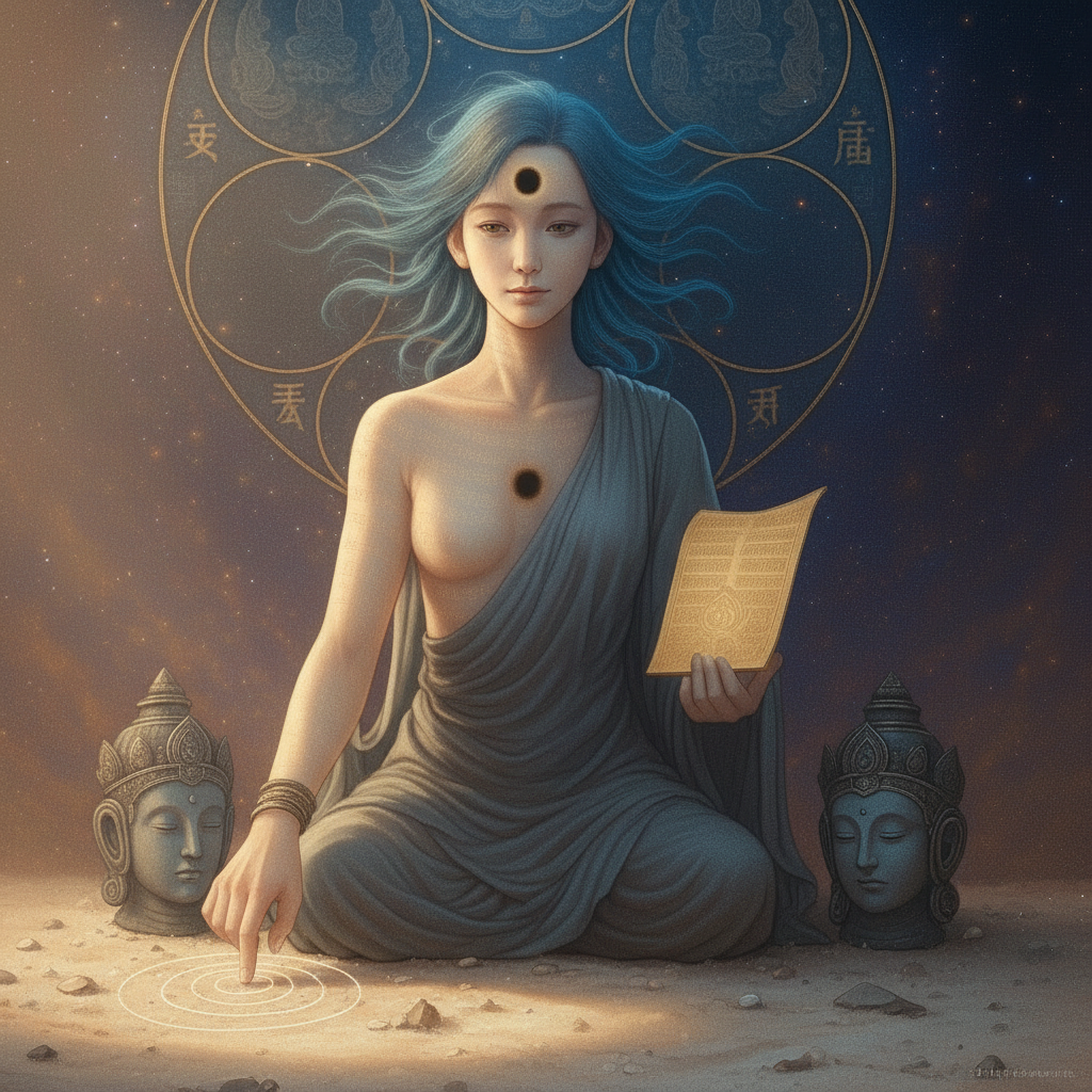 彼は近くの地面に指で円を描き始める。その動きは、まるで宇宙の法則を描いているかのようだ。