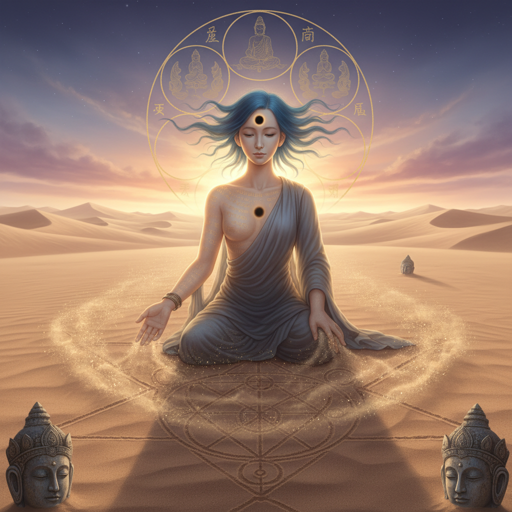 マイトレーヤは、砂に描いた図をそっと手で払い、風にまかせて消した。