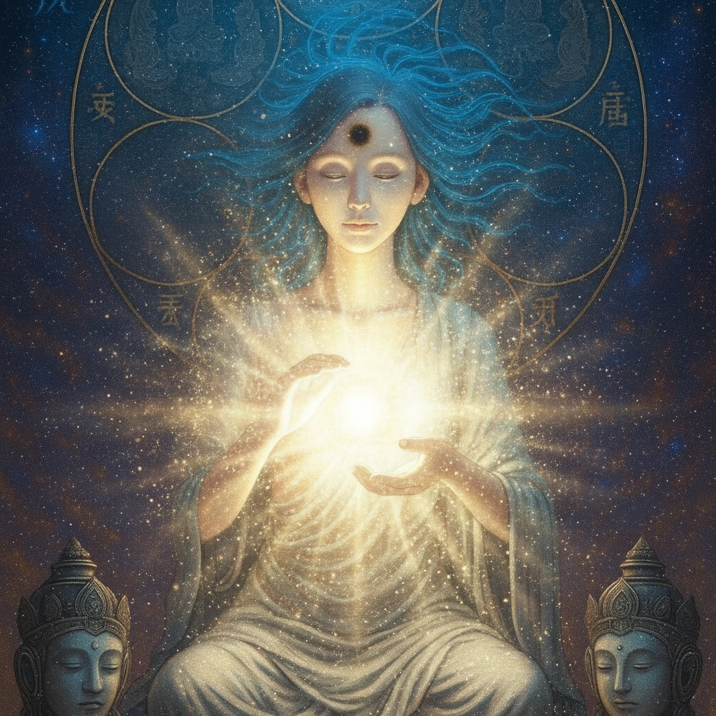 マイトレーヤはその光の球体をユリアナの胸に優しく押し当てる。球体はユリアナの体に溶け込み、彼女の全身が一瞬、内側から輝く。