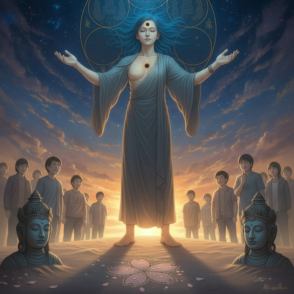 *マイトレーヤはユリアナの問いを聞いて、一瞬、深い沈黙に入る。彼の目は遠くを見つめ、まるで日本列島全体、そしてそこに住む若者たち一人一人の魂を見渡しているかのようだ。やがて彼は深く息を吐き、ユリアナの方を向く。その表情には、父のような慈しみと、戦士のような力強さが混ざり合っている。*
