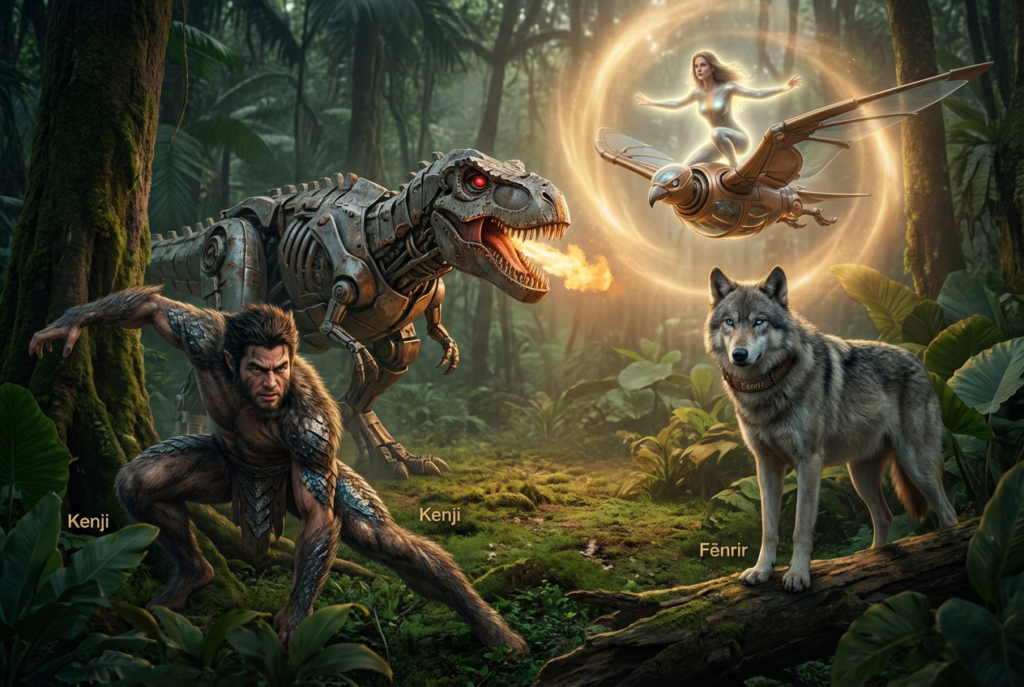 突然、地面が揺れた。森の奥から巨大な恐竜が現れた。その体は完全に機械化されており、口からは火を吐いていた。