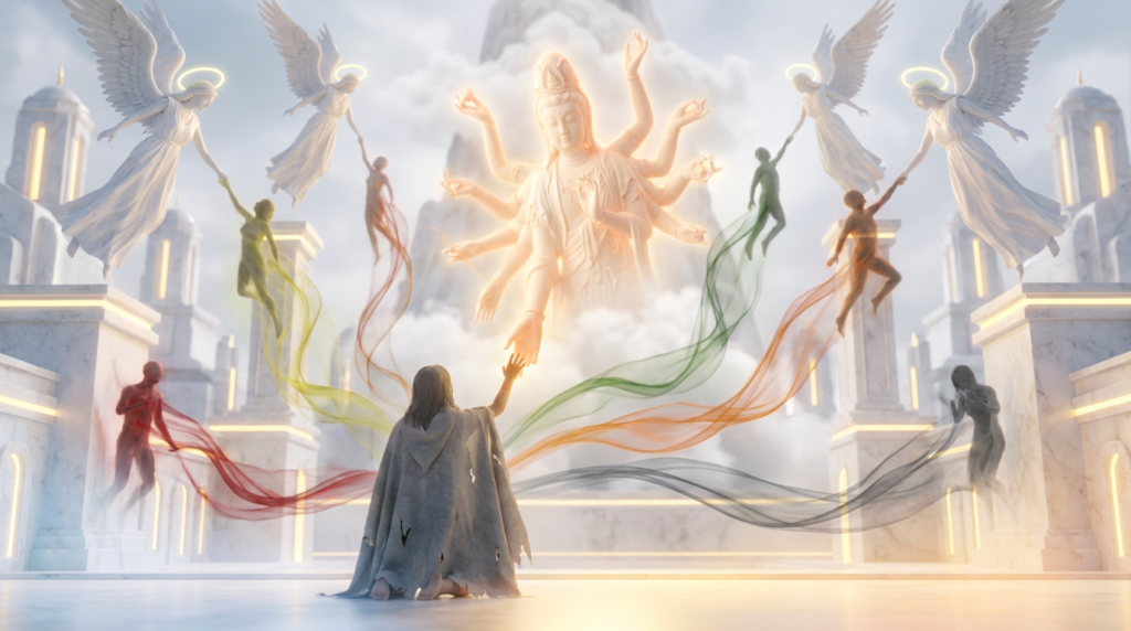 天界は雲海に浮かぶ美しい都市だった。白い大理石の建物が並び、金色の光が空間を満たしている。空気は清浄で、美しい音楽が天空から響いてくる。ここに住む存在たちは皆、光に包まれ、慈悲深い表情をしていた。