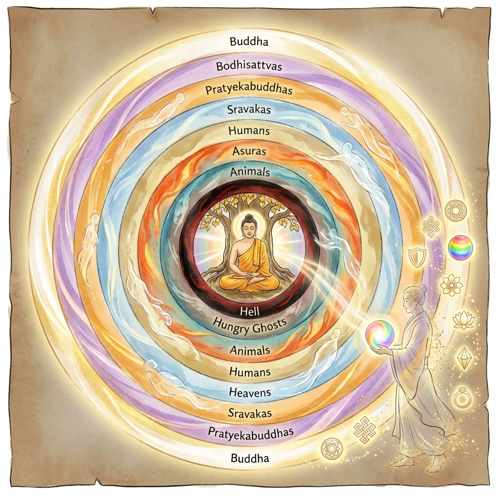 地獄界の絶望の中にも、成長への可能性がある。餓鬼界の欲望も、慈悲に転換できる。畜生界の本能も、理性と調和できる。修羅界の競争心も、協力の力になる。人界の日常も、聖なる場になる。天界の慈悲も、真の理解と共にあるべき。声聞界の知識も、実践と結ばれるべき。縁覚界の独立も、協調と両立できる。菩薩界の奉仕も、相手を尊重するものであるべき。そして仏界の智慧も、すべての存在と分かち合うべき。